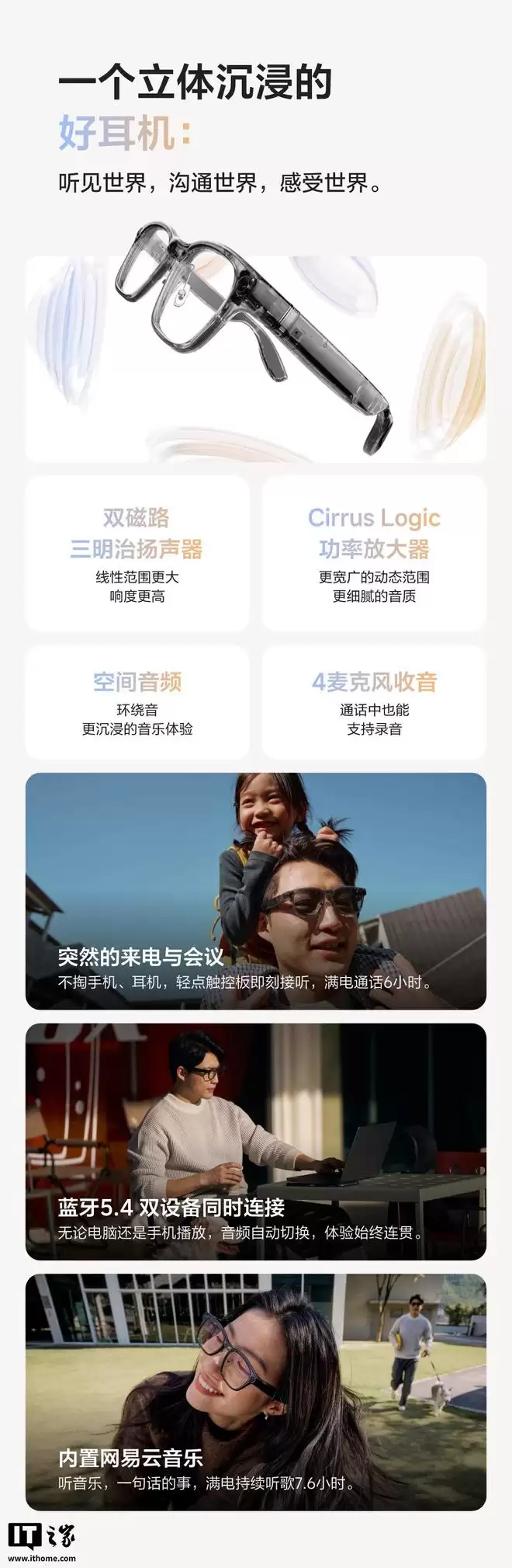 音频方面,眼镜内置了理想汽车空间音频技术,支持4麦克风降风噪拾音及Cirrus Logic功率放大器。双磁路三明治扬声器能让声场更开阔、响度更高,带来沉浸式的听觉体验。它支持蓝牙5.4双设备同时连接,并内置网易云音乐,满电后可连续听歌长达7.6小时。