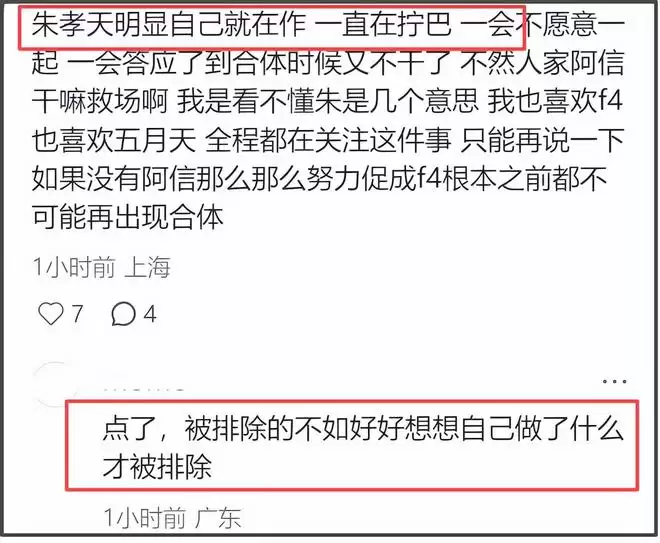 也有网友指责朱孝天没有团魂,合体后还在直播中强调和其他三人不熟,打破网友滤镜。一边期待合体,一边又说和队友不熟,被踢出局之后又说是自己不想去,实在太拧巴了。
