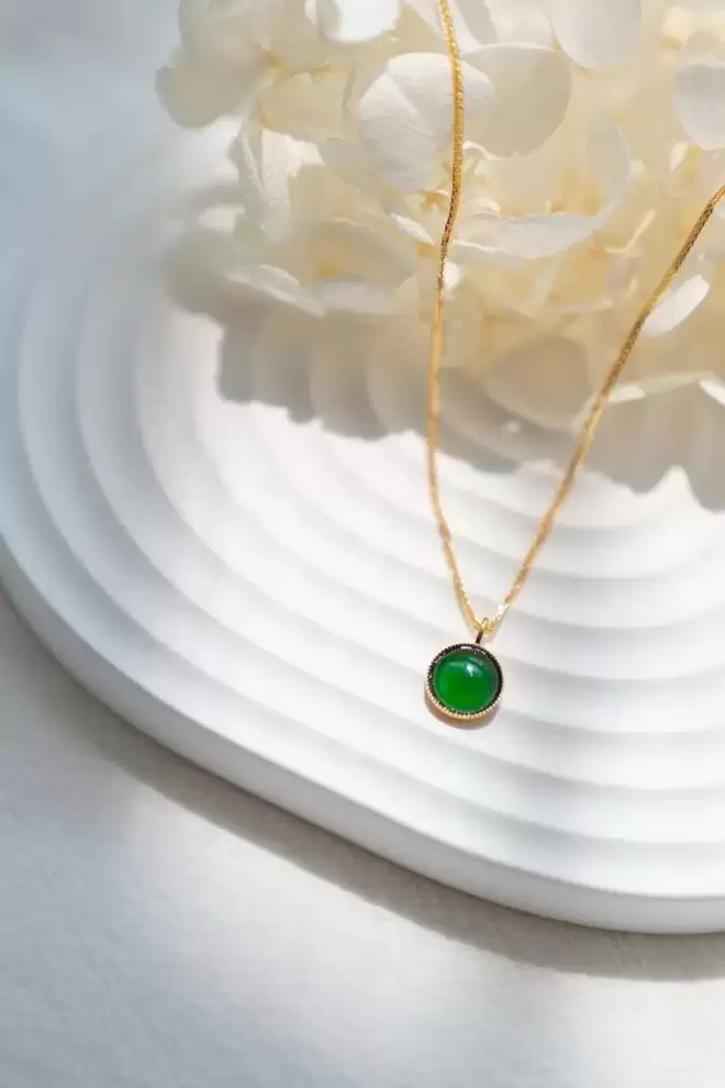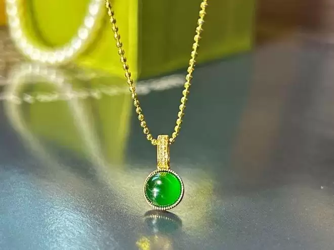 这颗就刚刚好,用的是7mm的冰种辣绿蛋面,个头不夸张,颜色却很出挑,是那种一眼能看出是好绿的阳绿,戴在锁骨窝那里很顺眼。外面一圈18k金小珠边,细细一圈,把蛋面托得很圆润。