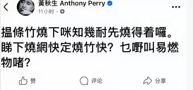 他在个人社交平台发文,让大家先试试竹子烧着需要多久,暗指竹制脚手架并非是此次大火的直接原因,与汪诗诗的言论一致。