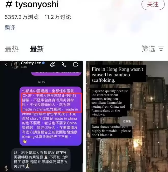 且整段道歉文字里,完全回避了曾经发文中的立场不明,且甩锅内地的问题,将关注点引向了竹子脚手架是否易燃这样的话题上。
