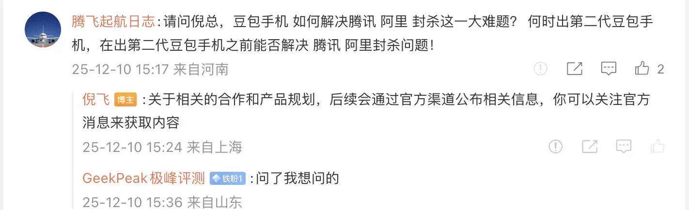 12月10日,努比亚总裁倪飞在社交媒体发文透露,他决定将微博评论区交由豆包手机团队来管理,届时豆包会亲自回复网友们的提问。