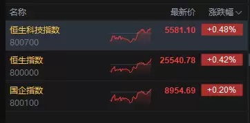 12月10日,港股三大指数集体上扬。截至收盘,恒生指数上涨0.42%,收于25540.78点;恒生科技指数涨幅为0.48%;国企指数则小幅收涨0.20%。盘面上,科网股普遍上涨,其中美团涨幅超过2%,百度、阿里巴巴、小米均录得超1%的涨幅;哔哩哔哩股价则小幅回调,下跌超1%。黄金股表现强势,灵宝黄金大涨逾9%;内房股走势强劲,万科企业涨超13%。此外,今日有两家新股挂牌上市,图达通大涨33%,宝济药业更是飙升138%。