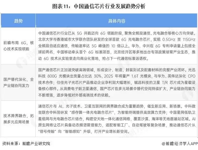 当前中国通信芯片行业呈现 6G 领跑、国产替代深化、跨界融合拓展的核心趋势。依托技术突破、政策支持与产业链协同,行业不仅在 6G 标准与核心技术上占据全球优势,更在高端产品替代与多元场景应用中持续突破。尽管仍面临部分技术瓶颈,但整体正从规模扩张向高质量发展转型,为数字经济与智能产业升级提供坚实支撑。