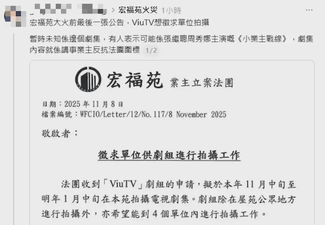 张继聪与周秀娜主演的ViuTV剧集《小业主战线》,原本以“一班香港地道小业主VS围标集团”为主线,讲述了小业主对抗霸权的故事。这部剧集写实风格引人期待,剧组原先借用了大埔宏福苑作为取景地。日前,网上流传一张被称为“宏福苑大火前最后一张公告”的图片,内容是关于在11月中至1月中将该屋苑借出场地予ViuTV剧组拍摄,希望征用其中四个单位。