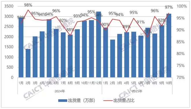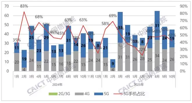 从2025年1月至10月的累计数据来看,国内手机市场总出货量约为2.52亿部,同比微增0.8%。在这期间,5G手机的累计出货量为2.17亿部,同比增长1.3%,占比达到86.0%。
