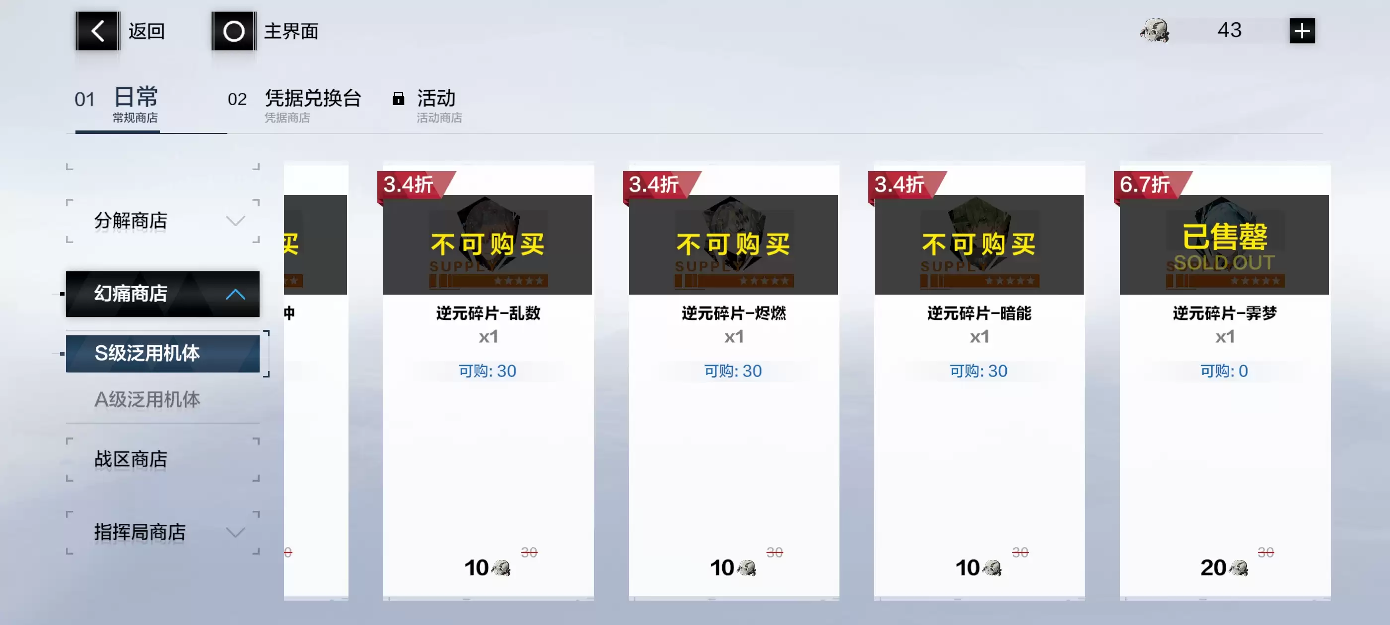 4、疾雷手册·勋业奖励进阶协议,68元。可获得对应份额的680黑卡、森息的6星专武、珍稀的6星武器共鸣材料、谐振加速器,以及大量的幻痛商店骨头(约500个)、意识养成材料。用赠送的骨头去幻痛商店可换30个逆元碎片,已经足够将S级夙梦的一个阶段提升至SS。其价值主要体现在专武,以及能快速获取大量骨头。此外,还有一共3个六星武器共鸣材料,武器共鸣后可设置技能,一般需要道具或同阶武器才能共鸣。(如下图,逆元碎片已售罄)