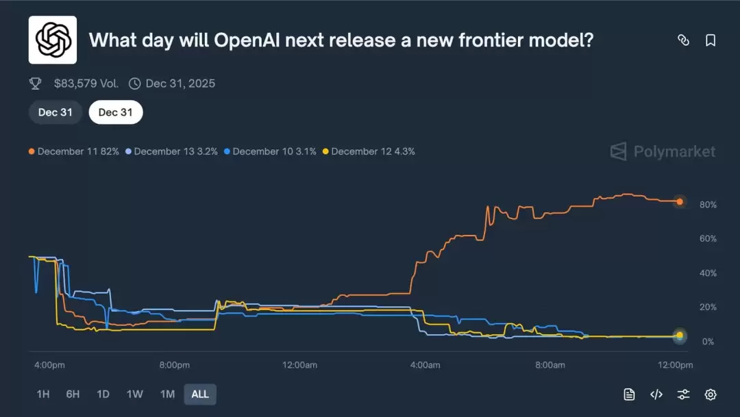 目前的市场情绪也已经彻底被点燃。在预测平台Polymarket上,原本押注 12 月 9 号发布的资金开始转向,目前的风向标死死盯着 12 月 11 日(本周四)。