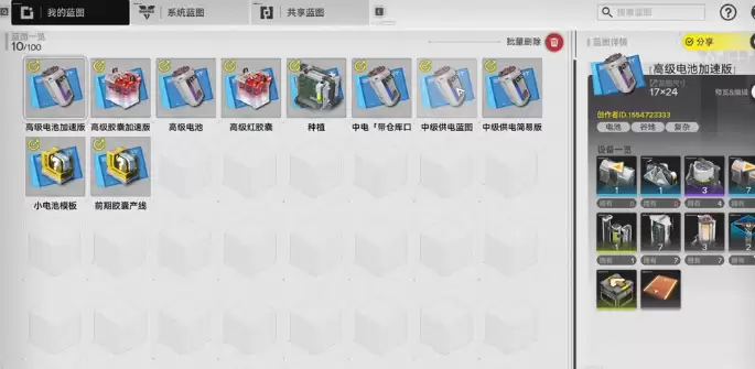 这条胶囊线还可以灵活切换原料。开局可以用紫晶矿作为原材料,制造出普通的胶囊。后期如果解锁了蓝铁矿,那就可以换成蓝铁矿来产出价值更高的产品。无需额外搭建新的产线,可以有效节省营地的空间。接着可以看一下电池类的产线,不同等级的电池所对应的供电需求也不一样。小电池的生产,可以使用系统自带的蓝图。前期银地没有升级,也还没有解锁仓库的去获客功能,可以通过手动的方法去挑选资源。至于终极电池,还有三款蓝图可以选择。若是营地空间比较紧张,就可以使用简易版本。