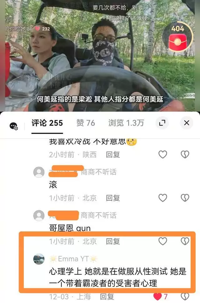 她只会要求梁淞必须完成她的指令,正如网友留言所说。何美延就是伪装成弱者的霸凌者,她对梁淞进行的是“服从性测试”。