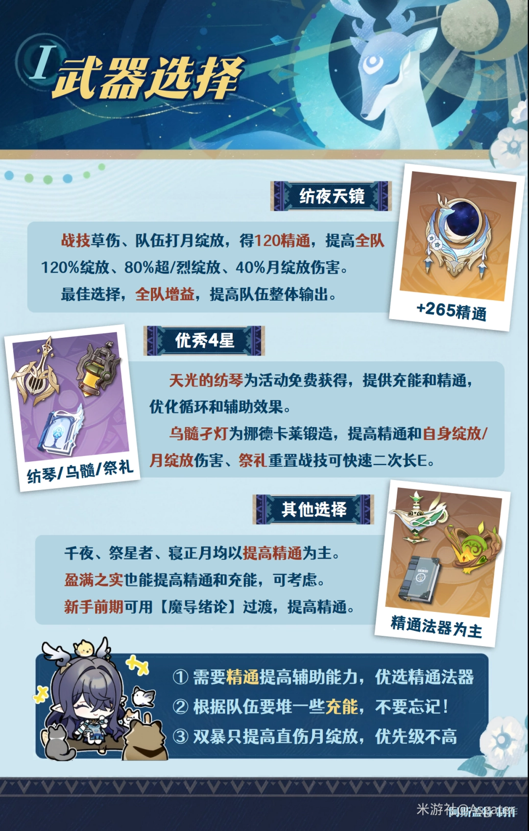 ⑥ 此外,还可以选择【流浪的晚星】(辅助攻击模组队友)、【魔导绪论】(前期过渡)等精通向法器;圣遗物提供的充能较少时,可选择充能武器(【天光的纮琴】为最佳),如西风秘典(提高35%充能效率+暴击产球)、盈满之实等。