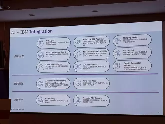 企业的应用设计、编程、测试、修复都可以通过AI完成,IBM的集成涵盖了所有的环节,包含API、应用、事件流、B2B/文件等。