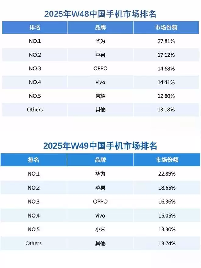 到了第49周(12月1日至7日),华为以22.89%的市场份额再度登顶国内手机市场,苹果以18.65%的份额位居第二。OPPO、vivo紧随其后,分列第三、第四名。小米则以13.3%的份额排名第五。