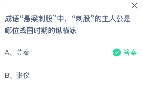 说起“悬梁刺股”这个成语,你知道“刺股”的主角是哪位战国时代的纵横家吗?支付宝小鸡课堂开课啦!每天花一分钟答题赚饲料,喂喂小鸡就能奉献爱心,轻松又有意义!2025年12月11日蚂蚁庄园的小鸡课堂题目正确答案是【苏秦】。苏秦为了实现自己的抱负,刻苦学习,甚至用绳子悬在梁上,用锥子刺大腿来保持清醒,表现出了极强的毅力和决心。