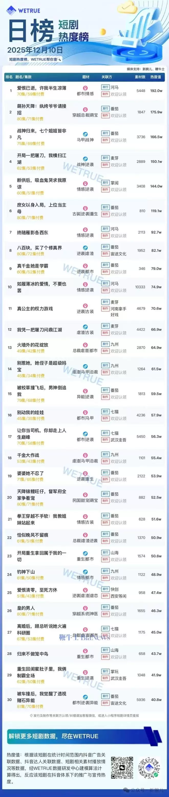 12月10日短剧榜:榜首《爱恨已逝》大盘4310万