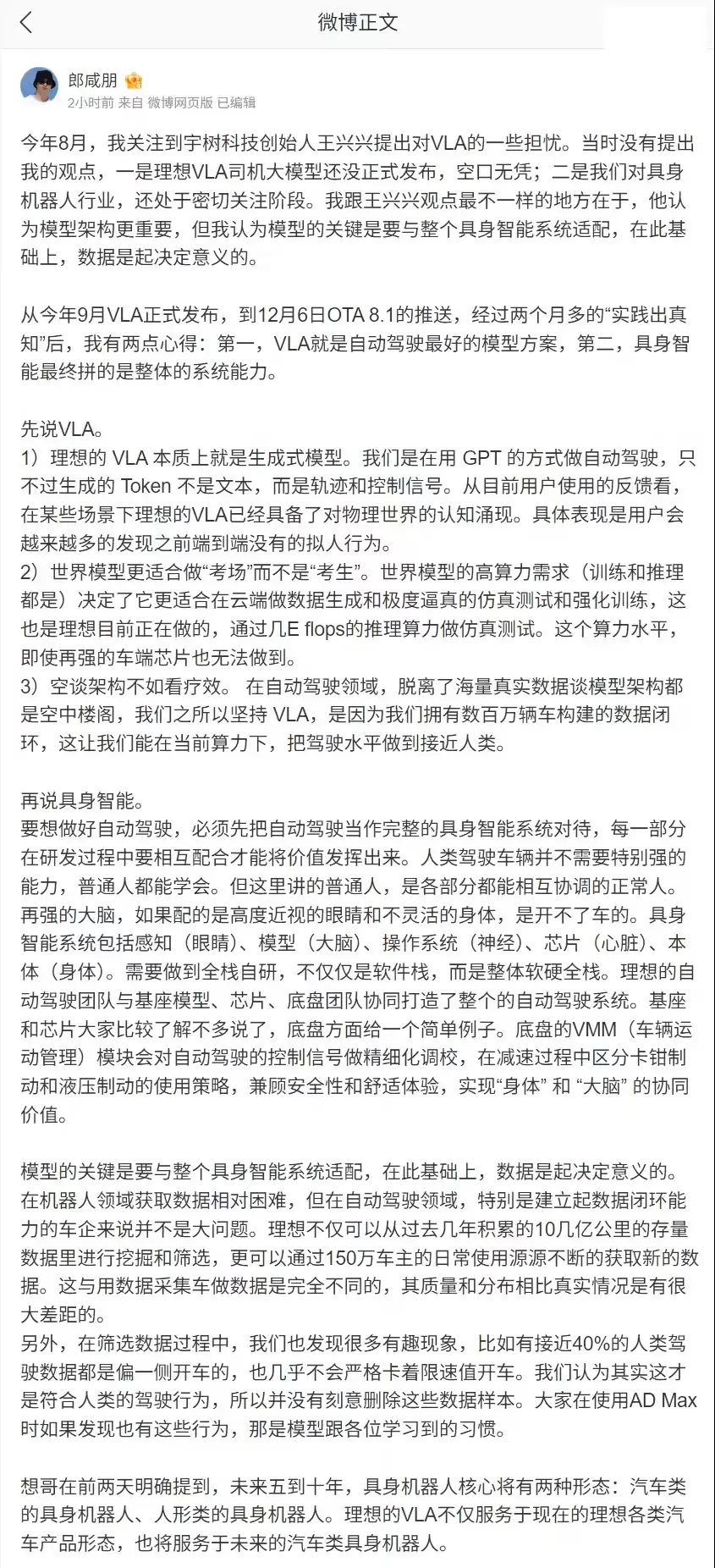 今年8月,我关注到宇树科技创始人王兴兴提出对VLA的一些担忧。当时没有提出我的观点,一是理想VLA司机大模型还没正式发布,空口无凭;二是我们对具身机器人行业,还处于密切关注阶段。我跟王兴兴观点最不一样的地方在于,他认为模型架构更重要,但我认为模型的关键是要与整个具身智能系统适配,在此基础之上,数据才是起决定性意义的。