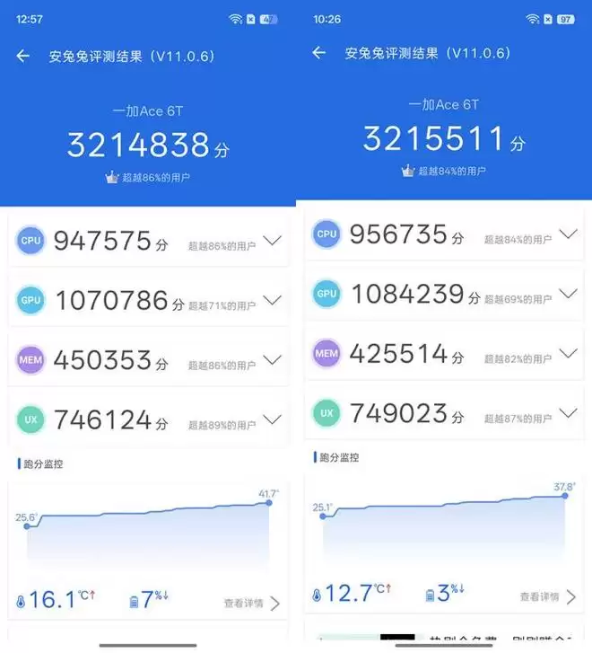 大家可能更关心,与搭载骁龙8至尊版的一加Ace 6相比,一加Ace 6T的性能表现如何。首先来看看跑分吧,常温环境下安兔兔评测跑分突破321万分,这其实就是骁龙8至尊版的同等分数表现。