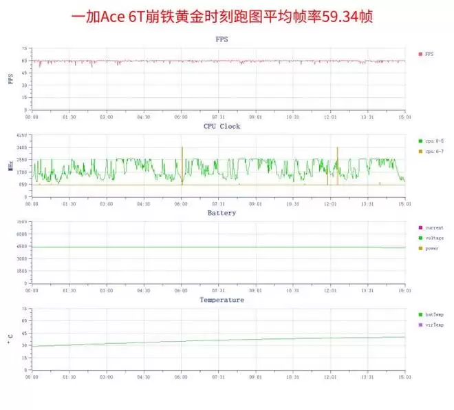 《原神》40分钟跑图打怪测试中,一加Ace 6T平均帧率60.69帧,1% LOW帧56.4帧。正面温度40.5℃,背面40.8℃,手感仅温热。
