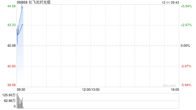 长飞光纤光缆(06869)昨日涨幅超过10%,今日股价再度高开近4%。截至发稿时,该股上涨3.28%,报43.46港元,成交额达2.53亿港元。