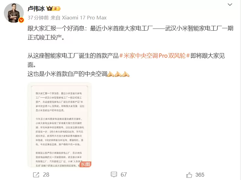 12月11日,小米集团-W(01810.HK)合伙人、总裁卢伟冰通过微博宣布,公司首座大型家电工厂——武汉小米智能家电工厂一期项目正式竣工投产。从这条智能产线下线的首款产品“米家中央空调Pro双风轮”,即将与广大消费者见面。这也是小米品牌推出的首款自主研发的中央空调产品。