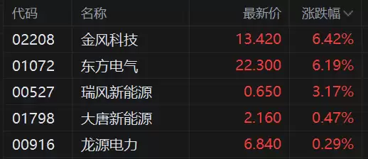 港股风电板块集体走高,多只个股表现强势。其中,金风科技与东方电气涨幅超过6%,瑞丰新能源上涨逾3%,大唐新能源、龙源电力等也同步跟涨。