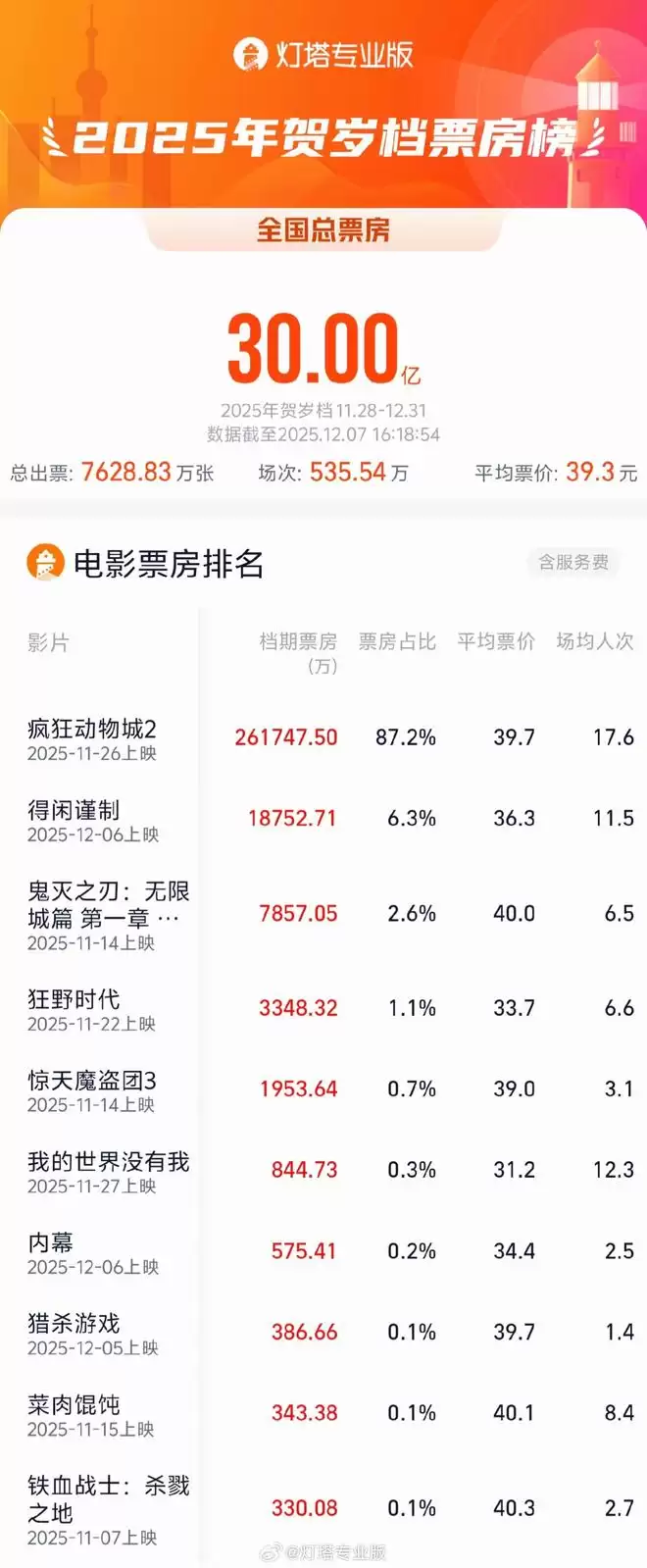 根据灯塔专业版最新数据,截至12月7日16时18分,2025年贺岁档影片(11月28日至12月31日)累计总票房(含预售)已突破30亿元大关。