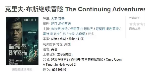 小李:早期确实有过相关讨论。说实话,我迫不及待想看到克里夫·布恩的故事被搬上银幕,不过这次我不会参与演出。我认为大卫·芬奇是执导这个项目的不二人选。昆汀是他的头号粉丝,我也深深钦佩他的作品,没有人比他更适合延续这种电影血统并讲述那段故事。这将是克里夫·布恩人生的新篇章。我十分期待能看到成片。