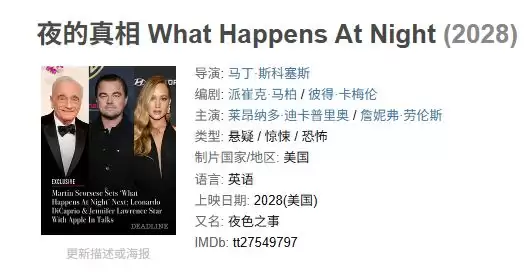 问:你在选择角色时总会优先考虑大导演,马丁·斯科塞斯位列榜首。关于你和另一位奥斯卡得主詹妮弗·劳伦斯合作的《夜的真相》,你能告诉我们要期待什么吗?目前的描述让人联想到《闪灵》和《禁闭岛》。