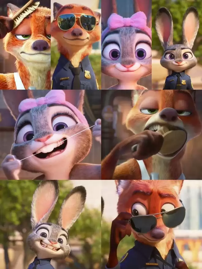 最具创意的则是朱迪与尼克为了人物而“伪装”的格式各样的“变装”,都展现出了与平时“警官”装扮完全不用的造型,叛逆且充满个性,完美呈现了他们的“街头文化”氛围。