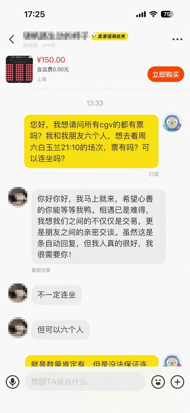 记者以消费者的身份咨询该卖家,询问其是否销售CGV影城(白玉兰广场IMAX店)周六的六张“已售罄”场次电影票,对方回应称“座位不一定连在一起,但可以保证六个人进场”。当记者进一步追问,能否更换时间场次或换一家影院以实现六人连座时,对方表示“得下周再看看”。至于卖家所售电影票的真实性,仍有待进一步核实。