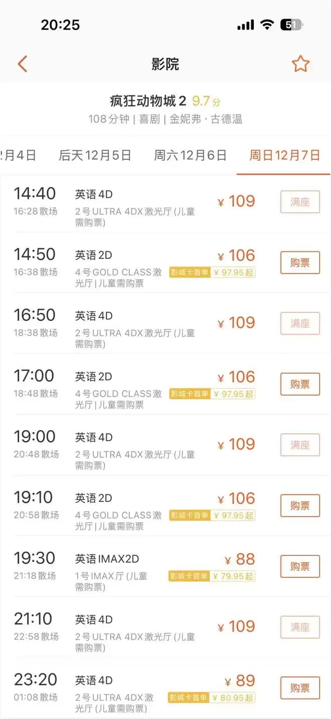 在主流第三方票务平台上查询,CGV影城(白玉兰广场IMAX店)和CGV影城(晶耀前滩杜比ULTRA 4DX店)的《疯狂动物城2》英语4D场次票价基本在110元左右。截至12月3日晚,CGV影城(晶耀前滩杜比ULTRA 4DX店)12月4日还在售的4D场次只剩下晚间7:50的一场,而当天的其他六场4D场次均已显示满座。目前,该影片在12月5日、6日及7日全天的所有4D场次也已全部售罄。