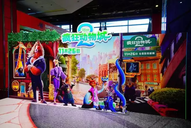 2025年12月3日,北京西单大悦城首都电影院内展示的《疯狂动物城2》巨幅海报。 视觉中国 图