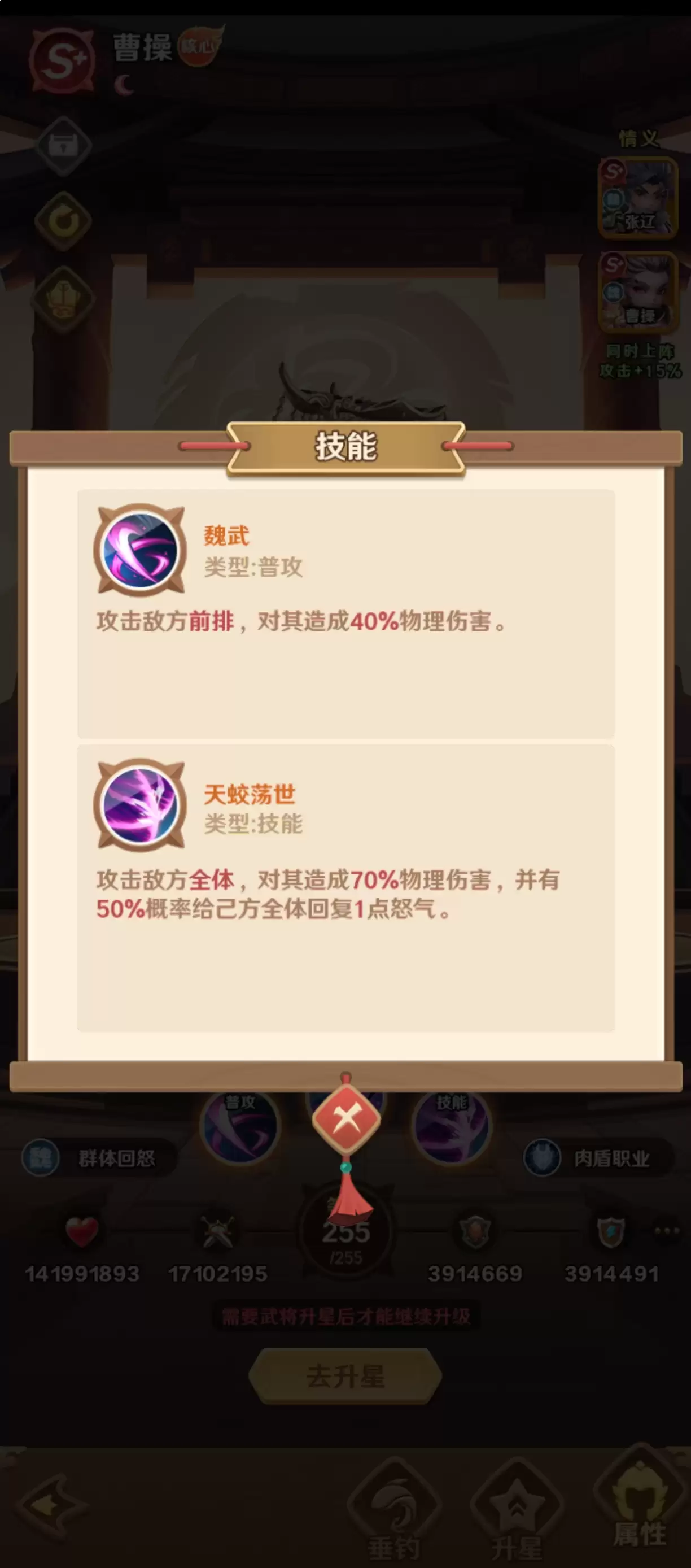 曹操在魏国阵营中,能够对敌方前排造成可观的物理伤害。值得注意的是,虽然这种伤害的基础值相对稳定,算不上爆发型输出,但他的技能在施展时却能为全体敌人附加70%的物理伤害,并且还有一定概率为己方队伍恢复怒气值。这种怒气恢复效果至关重要,它不仅能有效提升团队的核心输出能力,还能增强全队武将的技能释放频率,加快技能循环速度,从而在持久战中保持强大的作战压制力。