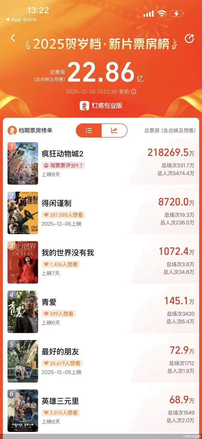 北京商报讯(记者 和岳)12月3日,灯塔专业版数据显示,截至12月3日13时23分,2025年贺岁档(11月28日—12月31日)总票房已突破22.8亿元。其中,《疯狂动物城2》以21.8亿元的成绩断层领先,持续领跑贺岁档票房榜。