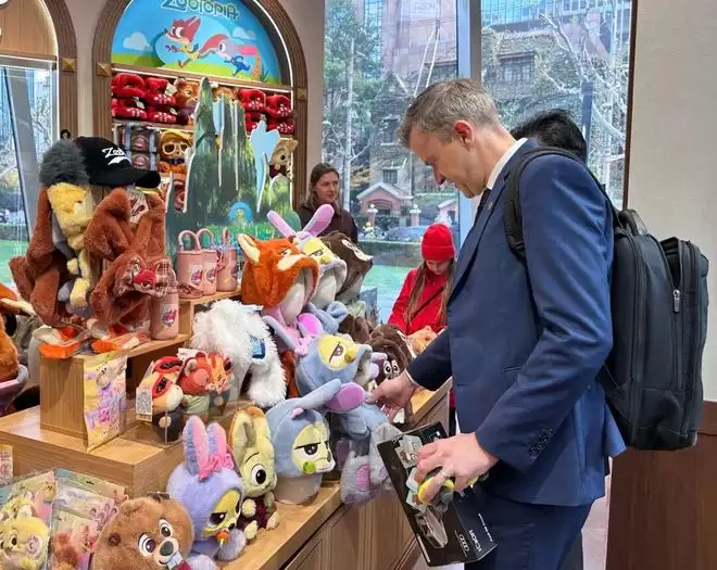 12月2日下午,记者来到位于上海静安的MINISO+LAND,《疯狂动物城2》IP的帽子、公仔、玩偶、水杯等一系列商品吸引了许多中外消费者选购。
