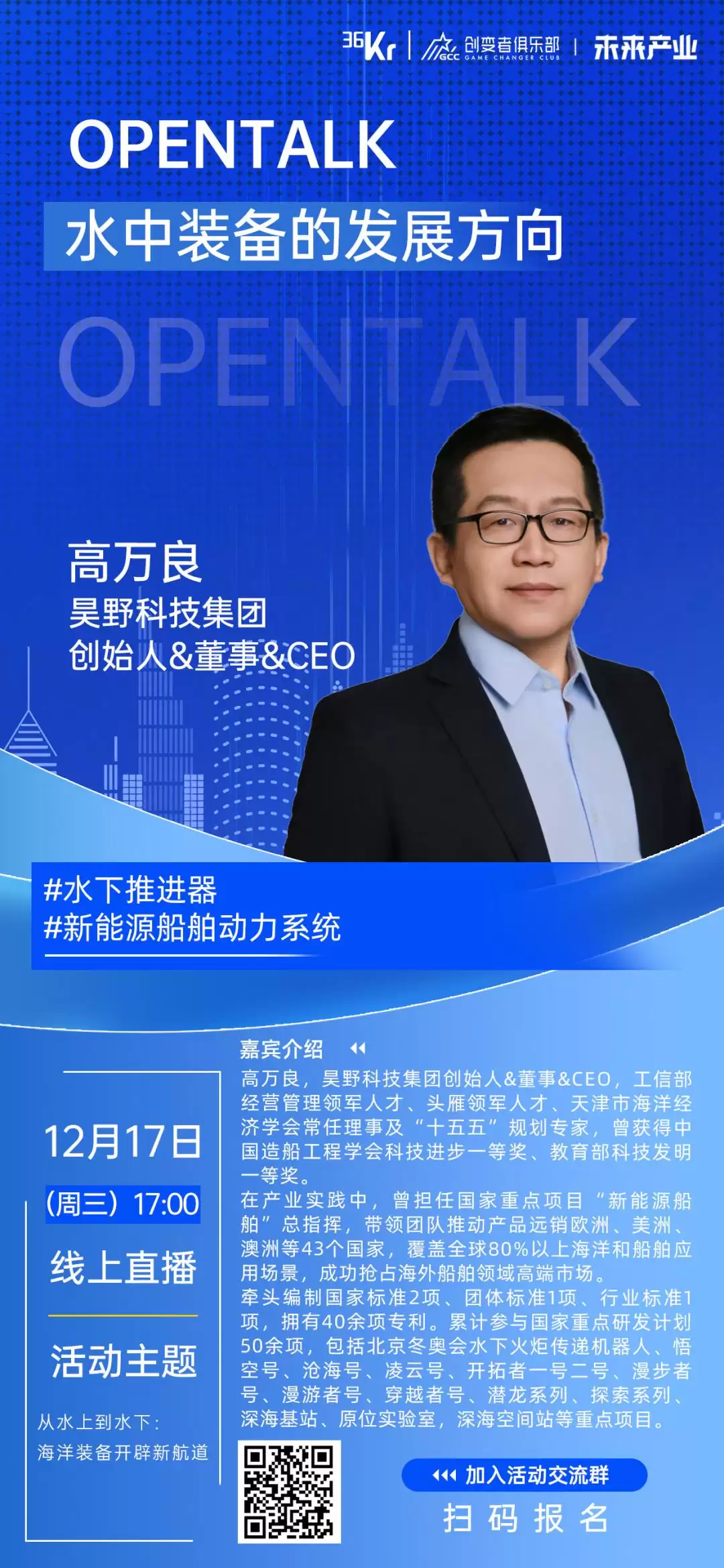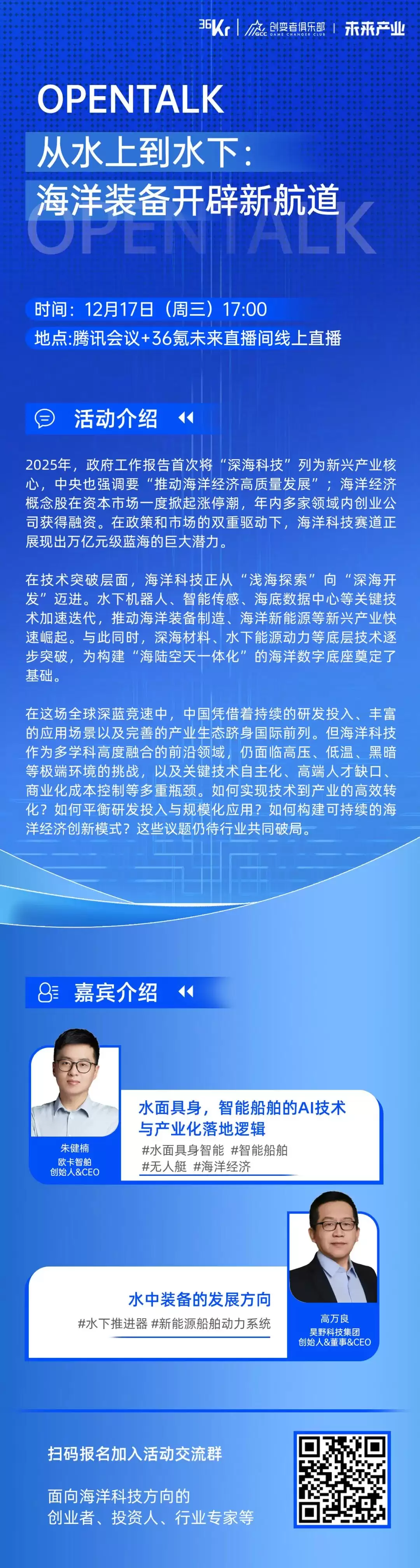 欢迎关注海洋科技的创业者、投资人及从业者扫描下方活动海报二维码报名,参与和两位嘉宾的线上互动,共同探索蓝色经济的发展新动能。