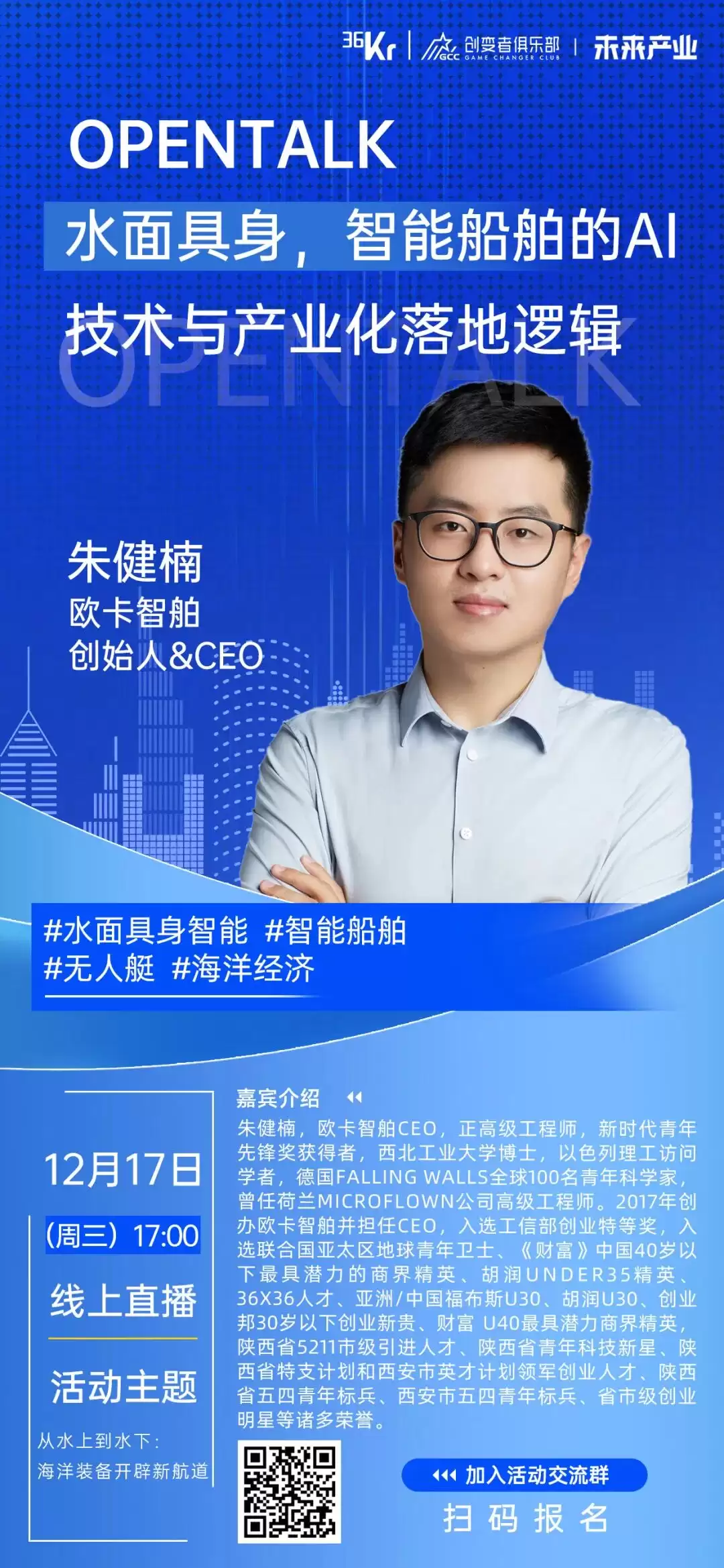 2025年12月17日(周三)17:00,OpenTalk将特别举办「从水上到水下:海洋装备开辟新航道」直播活动。我们特邀欧卡智舶创始人兼CEO朱健楠、昊野科技集团创始人兼董事长兼CEO高万良两位嘉宾,他们将分别围绕“水面具身,智能船舶的AI技术与产业化落地逻辑”与“水中装备的未来发展方向”两大主题展开深度分享。活动将聚焦智能船舶、水面无人驾驶系统、水下推进器、新能源船舶动力系统等前沿热点,共同探讨海洋科技领域的“破局点”与“未来式”。