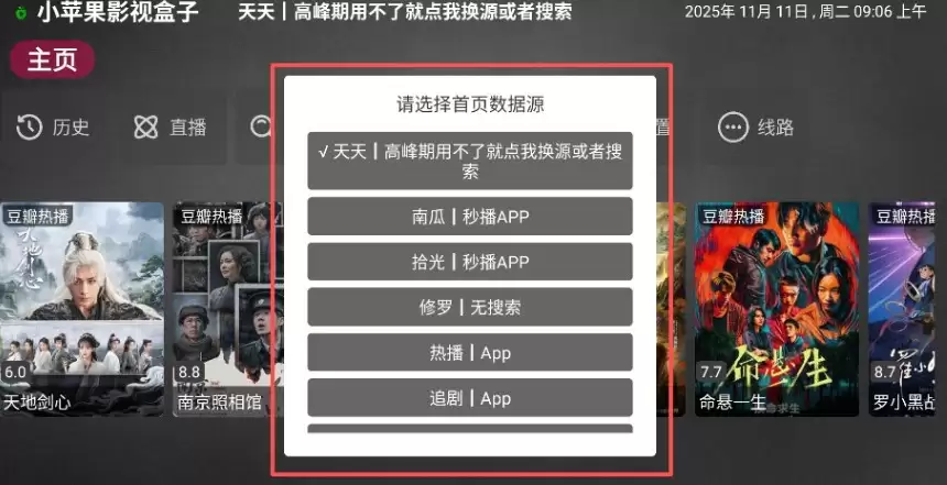 3、返回首页,点击“首页”就能看到丰富的影视资源。任意选择一个数据源,就可以开始观看视频了;