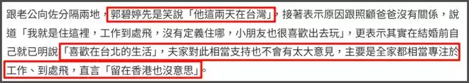 郭碧婷出席活动的时候,也透过媒体采访回应了一些网友质疑,提到夫妻两人分居的问题,郭碧婷先不忘维护老公形象,爆料他这两天也在台湾省,但又默认和向佐两地分居,说自己就是住在台湾省,暗示向佐平时并不在身边。