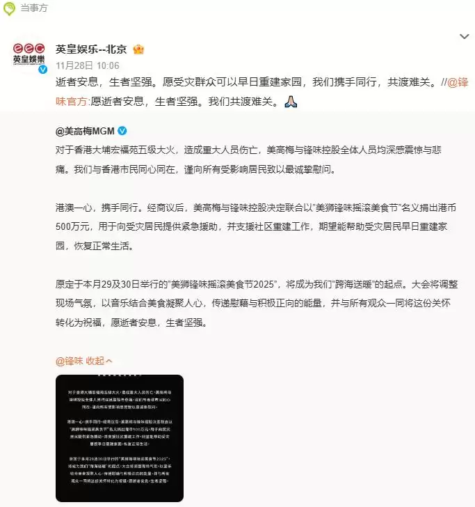 事实上,早在火灾发生的当天,谢霆锋就已经发文为受灾民众祈福,并特别提到了灭火英雄的安全。