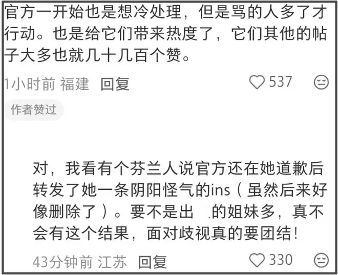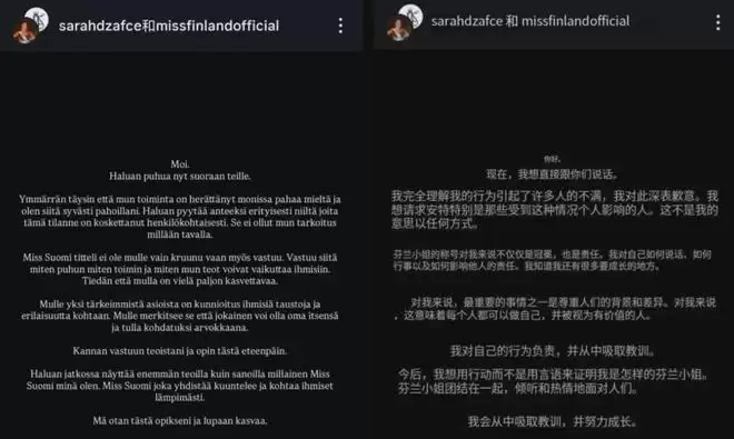 随着Sarah和芬兰选美比赛主办方评论区沦陷,他们终于联合发布了一篇道歉动态,只是Sarah的道歉毫无诚意,她依旧不承认自己存在歧视行为,狡辩是因为文化差异引发了误会,还数次强调自己配得上芬兰小姐称号。