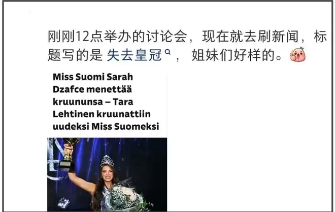 自此SarahDzafce成了任期最短的芬兰小姐,以后就是那个歧视中国人被取消冠军头衔的前芬兰小姐了!