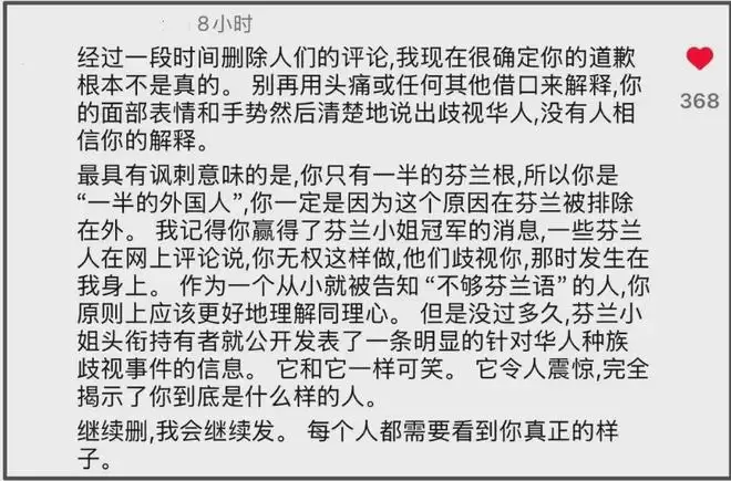 与此同时,网友还扒出Sarah的家世背景,原来她的父亲来自科索沃,因为混血儿身份,Sarah参加芬兰小姐选美还遭到了歧视,一个经历过歧视的人,竟然还能当众做出歧视行为,可见Sarah行为恶劣,对我们可谓是充满恶意,光道歉可不够!