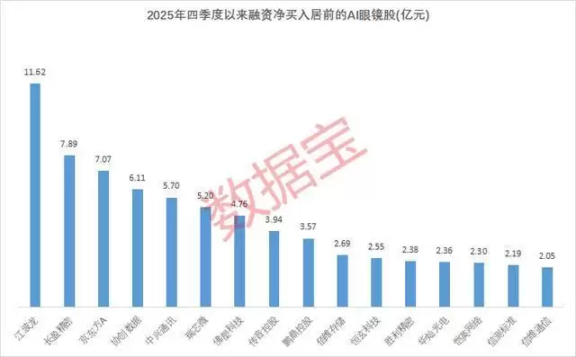 数据宝梳理了2025年四季度以来(截至12月11日),融资客净买入居前的AI眼镜股,金额在2亿元以上的个股共计16只。江波龙稳居榜首,金额高达11.62亿元;长盈精密、京东方A、协创数据、中兴通讯、瑞芯微等个股紧随其后,金额均在5亿元以上。
