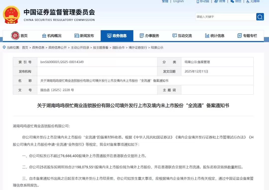12月11日,中国证监会发布了《关于湖南鸣鸣很忙商业连锁股份有限公司境外发行上市及境内未上市股份“全流通”备案通知书》(以下简称:备案通知书),鸣鸣很忙上市备案已获通过。