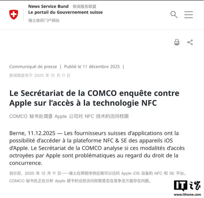12月11日,据IT之家报道,瑞士竞争委员会(COMCO)通过政府门户网站发布公告,宣布当地应用程序供应商现已能够访问苹果iOS设备的NFC和SE平台。目前,COMCO秘书处正在分析,苹果此次授予的访问权限是否在竞争法层面存在问题。