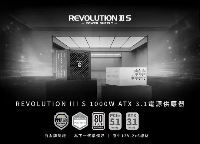REVOLUTION III S 1000W电源已获得三大权威机构的80 PLUS白金认证,能够承受高达200%的整机瞬态负载偏移。它采用了LLC谐振与DC-DC的成熟电路拓扑,内部搭载了全日系电解电容,并配备了压纹模组线材,提供一组原生支持600W功率的12V-2×6供电接口。