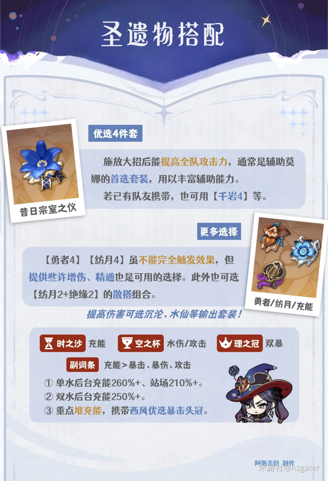 ⑤ 如果想提升大招伤害或站场输出能力,则可考虑水仙套、沉沦套或攻击2件套等,但需兼顾元素充能效率,此搭配更多面向真爱玩家。