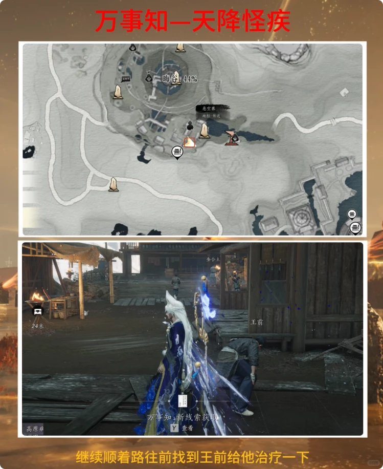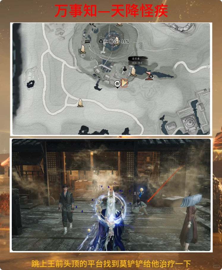 然后,跳上王前头顶的平台,找到莫鍮鍮并为他进行治疗。