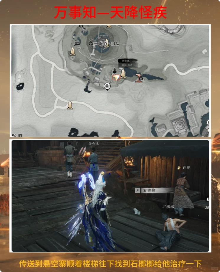 根据指引传送到悬空寨,沿着楼梯往下走,找到石橪橪并为他进行治疗。